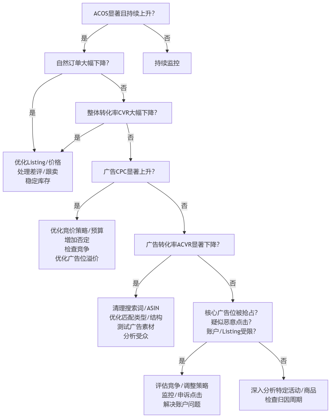 解决Listing问题: 确保广告引入的流量能被Listing有效承接转化。耐心很重要)。稳定库存等。ACOS的上升是否由广告漏斗效率下降引起?